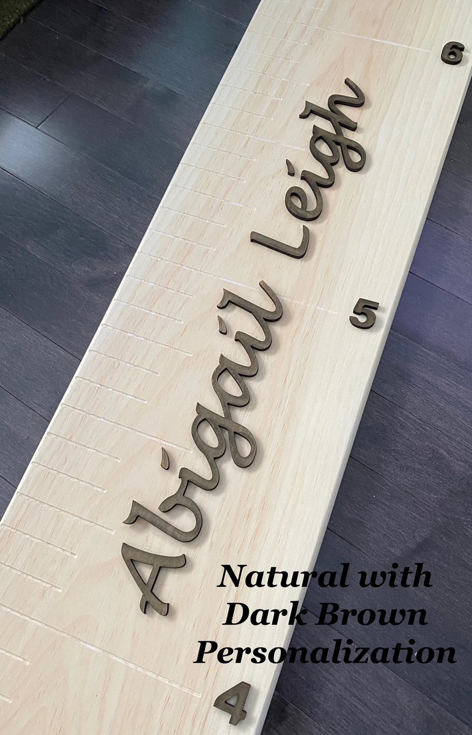 You can choose the name, font and the starting height (numbers)! The name and numbers will be made with raised wooden lettering while the lines will be engraved into the growth chart. Together, this creates a beautiful 3D effect. Lettering and numbers may look metallic but is actually natural wood (NOT GOLD), not stained or painted.