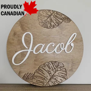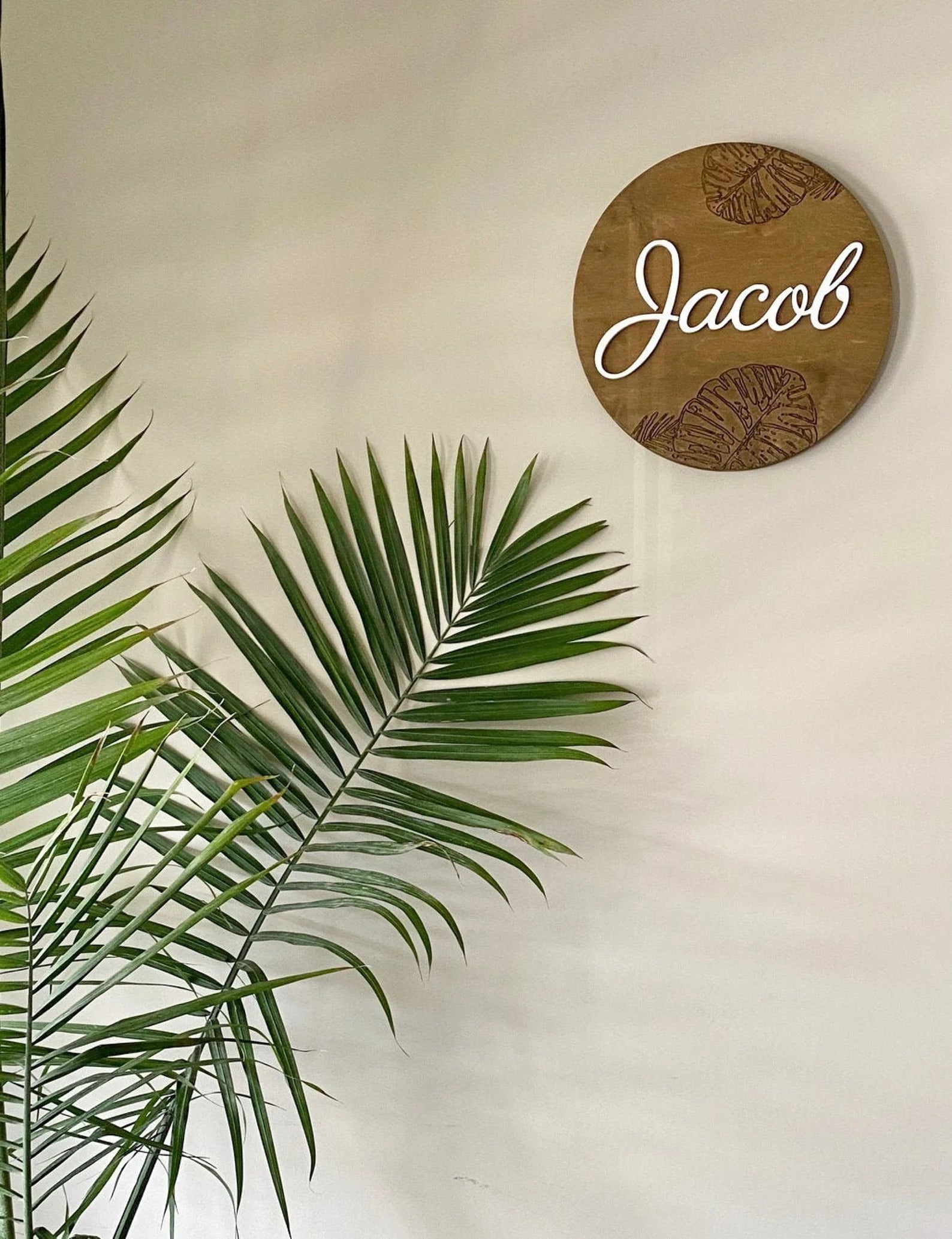 Each palm leaf design is carefully engraved into the name sign, while the raised wooden lettering creates the beautiful 3d effect you see in the pictures above.